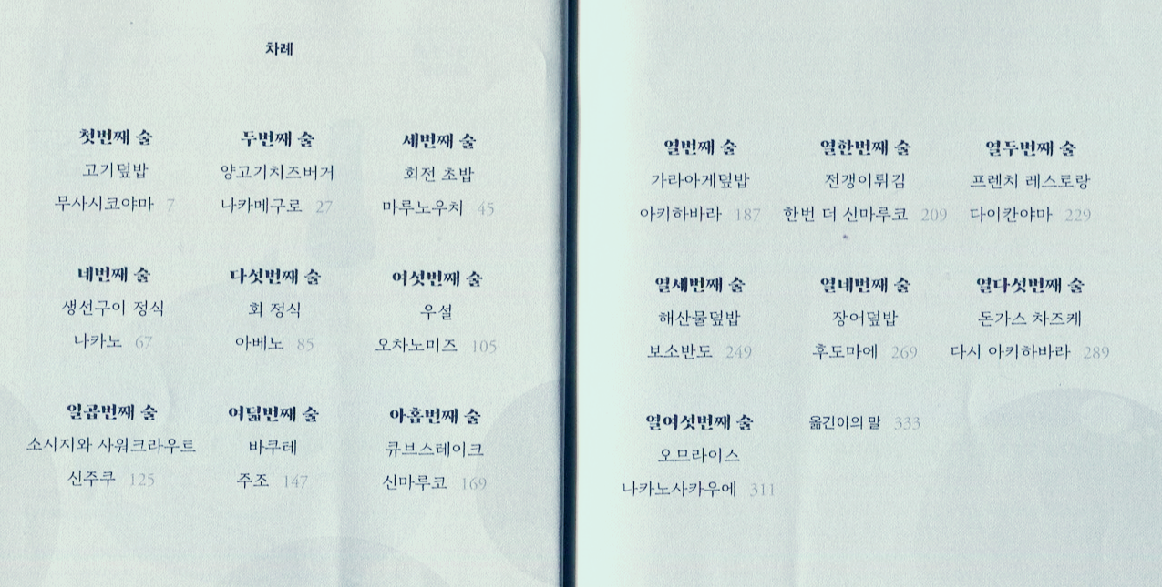 제목처럼 차례도 독특하다. 첫 번째 술부터 열여섯번째 술까지 총 열여섯 챕터로 이루어진 소설은 차례는 술이지만 제목은 음식으로 되어 있다. 그리고 그 아래에는 식당의 위치를 알려주고 있다. 실제로 존재하는 식당의 음식과 술이 소재로 사용되었기에 그 묘사가 더 구체적인 것이 큰 특징이다. 심지어 일본의 음식에 대해서는 잘 알지도 못하지만 묘사만으로 군침이 도는 경험도 할 수 있을 정도이다.