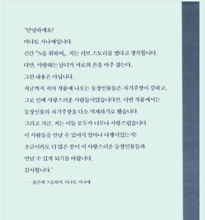 이 4명이 자신의 과거와 사건에 대해 각각 고백하는 것으로 나머지가 꾸며져 있다. 미나토 가나에라는 작가가 고유의 독백체를 유지하고 있긴 하지만, 사건 특히 살인 사건이 일어나고 관계자가 자신의 이야기를 하는 플롯은 『왕복서간』을 제외하고는 거의 비슷하게 반복되는 것 같아 조금 식상하기도 하였다. 이쯤 되면 반전이 나올 것 같다는 어설픈 예측도 가능했으니 말이다. 하지만 『N을 위하여』 그런 독백체 형식과 반전을 조금 더 날카롭게 벼리고 나온 것 같은 소설 같았다.