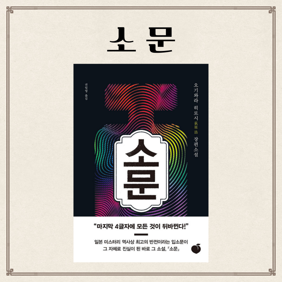 2009년 국내에 처음 출간된 되어 최근에 복간된 오기와라 히로시의 『소문』은 이렇게 광고를 위해 만든 소문이 실제로 일어난 사건을 다루고 있다. 아무래도 살인사건을 다룬 미스터리 스릴러이기 때문에 변사체가 나올 수밖에 없지만 발목을 잘라간다는 그 수법이 잔인하고 연쇄적으로 살인이 나오기에 읽기에 부담이 될 수도 있지만 주인공인 고구레와 나지마가 범인을 찾아가는 과정이 흥미롭게 그려지고 있다.