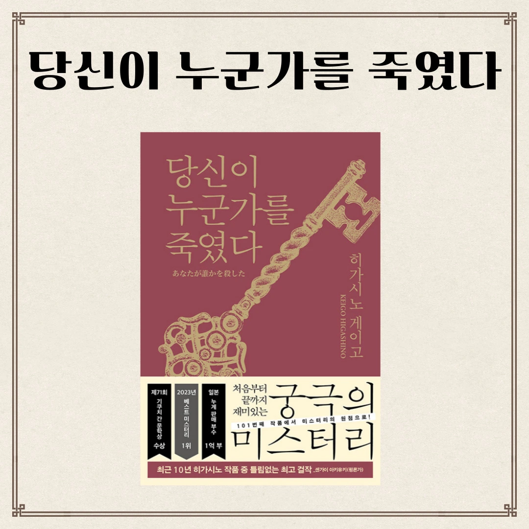 『둘 중 누군가 그녀를 죽였다』, 『내가 그를 죽였다 』 모두 히가시노 게이고의 가가 형사 시리즈의 제목이다. 제목이 독특해 소설의 내용보다 오래 기억에 남아 있는 몇 안 되는 소설이다. 비교적 최근작인 『당신이 누군가를 죽였다』도 아마 가가 형사 시리즈가 아닐까란 생각을 했다. 아니나 다를까 가가 형사의 열두 번째 미스터리이다. 최근 읽은 넬레 노이하우스의 『몬스터』가 타우누스 시리즈의 열한 번째 이야기였는데 이것도 우연이라면 우연인 셈이다.