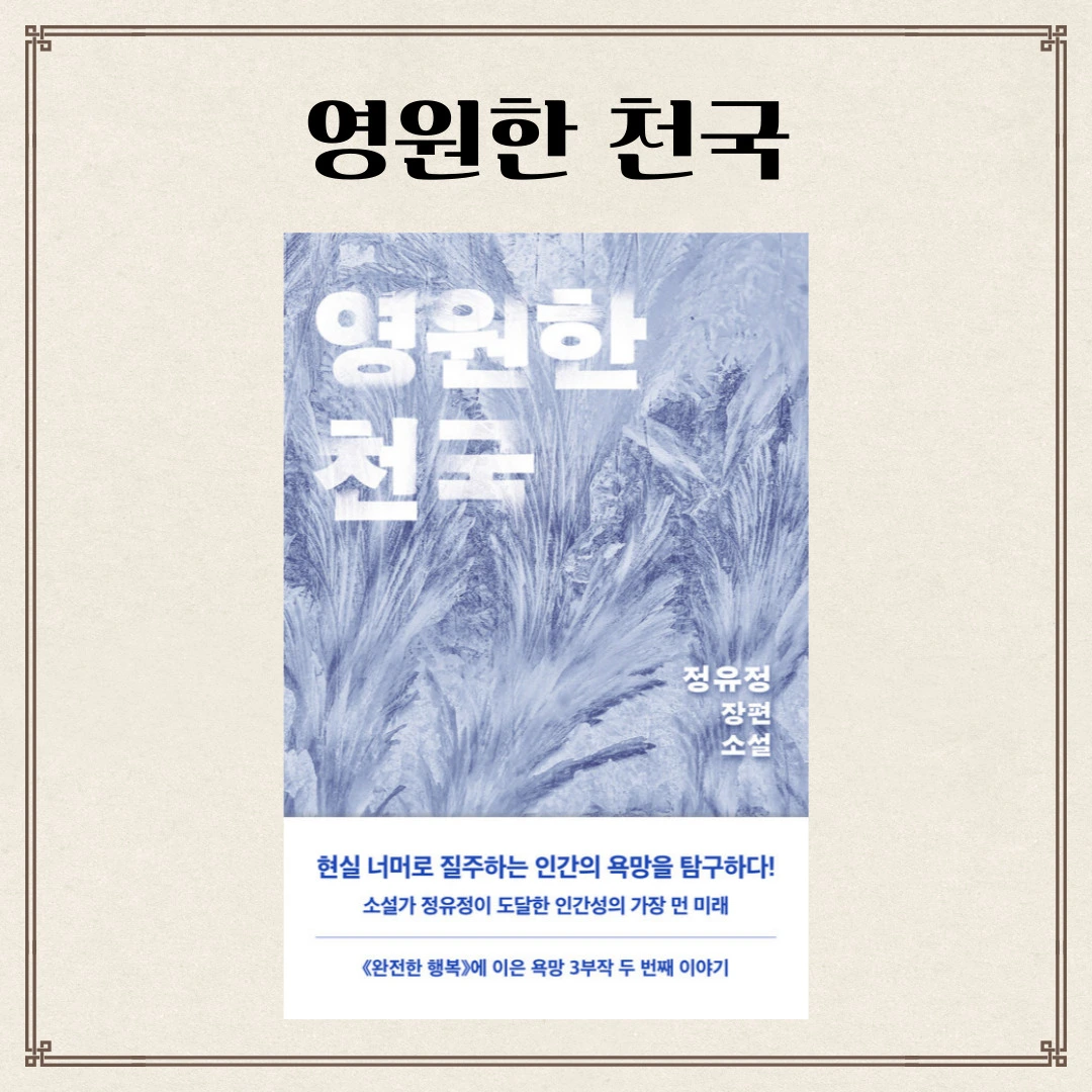 『7년의 밤』, 『28』 등 그동안 재미있게 읽은 소설이 많은 작가이기에 『영원한 천국』에서 조금 실망스러운 것도 사실이다. 정유정 작가의 다음 소설을 기대해 봐야겠다.