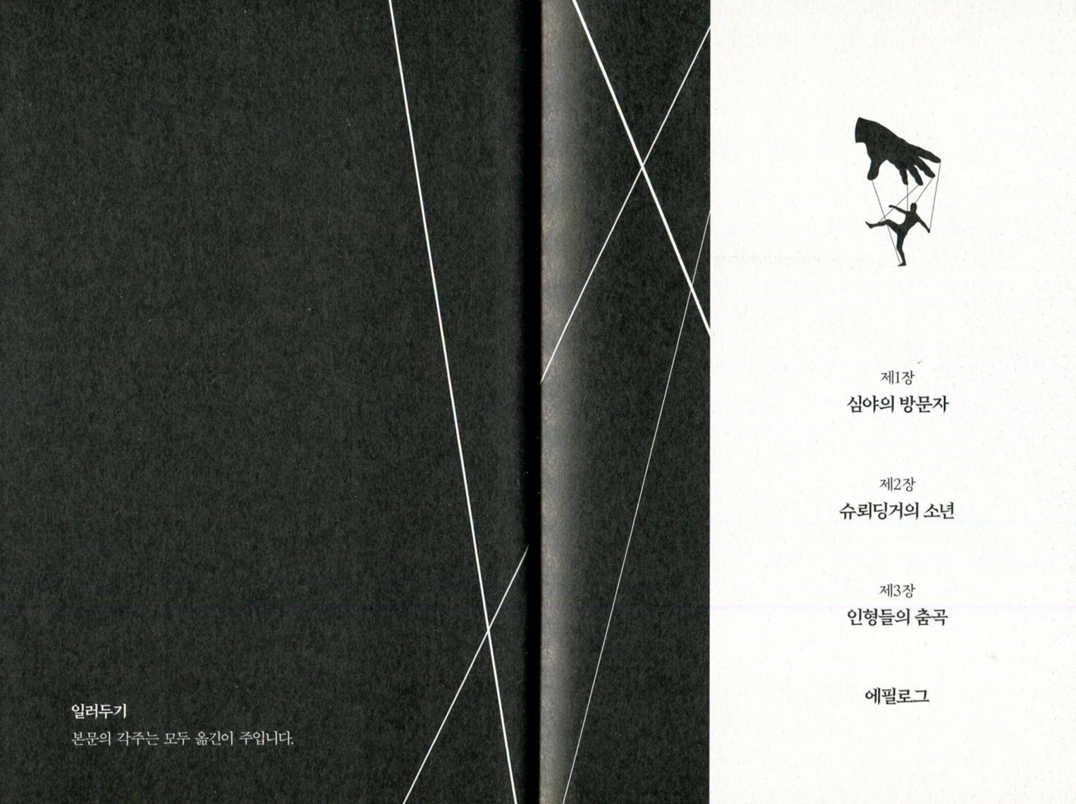 마지막 에필로그까지 범인의 정체가 공개되지 않지만 소설의 진행 상황에 따라 누가 마리오네트를 조종하는지에 대해 어렴풋이 느낄 수 있어 반전의 묘미는 조금 덜 한 것 같았다. 그럼에도 그 과정의 심리묘사 만으로도 충분히 스릴 있게 읽을 수 있었다. 조금 오글거리는 한밤중의 토막살인마라는 범인의 별명만 빼면 충분히 재미있게 볼 수 있는 미스터리 스릴러 소설이다.